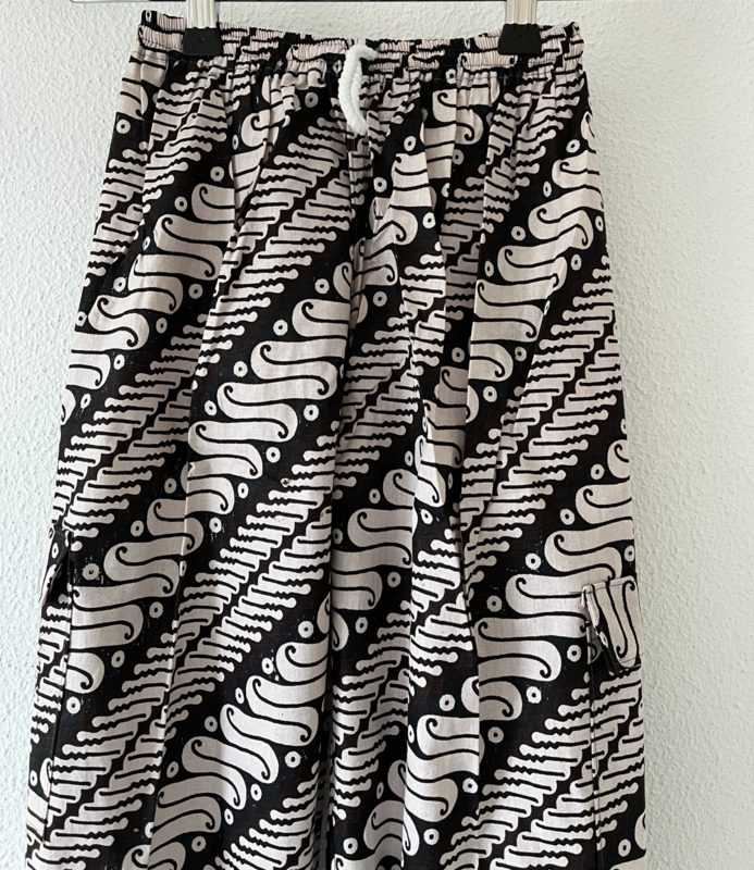 Met elastische taille en aantrekkoordje. Maat 116 en 134.