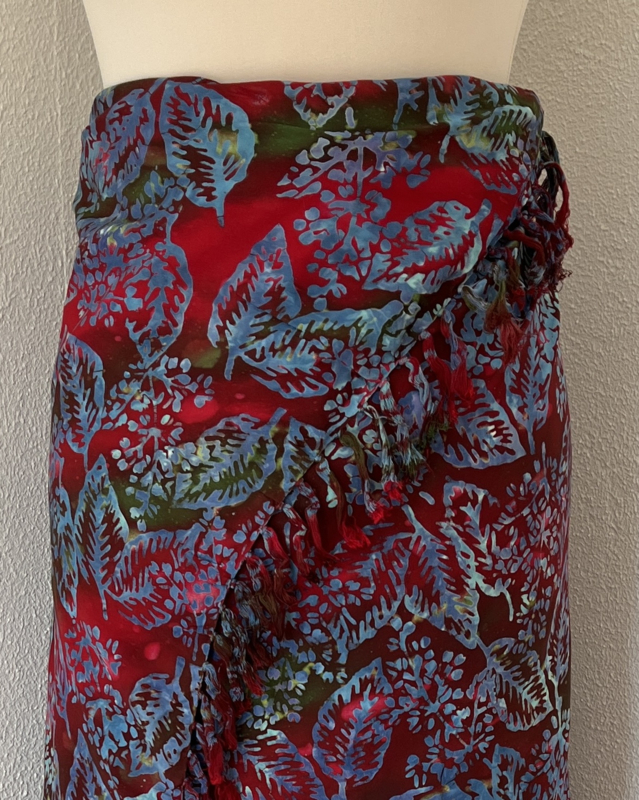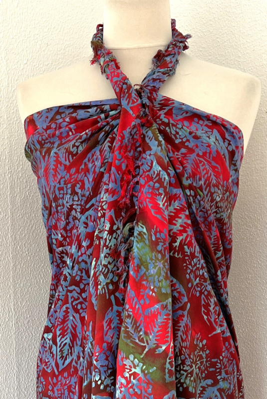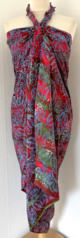 Uit de Busana Agung collectie en gemaakt met de BingBatik techniek uit Indonesie. 120 x184 cm. 100% rayon. Wasbaar op 30 graden. Met sarongknoop.