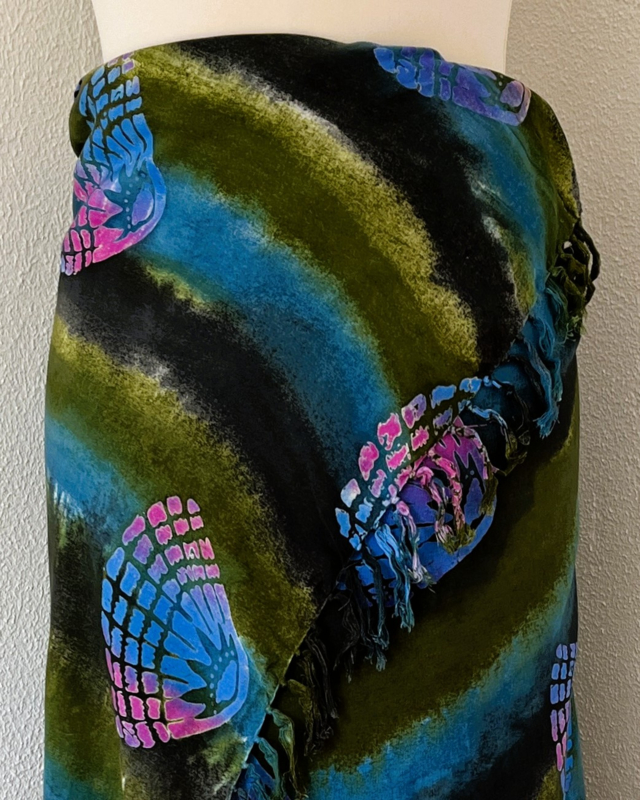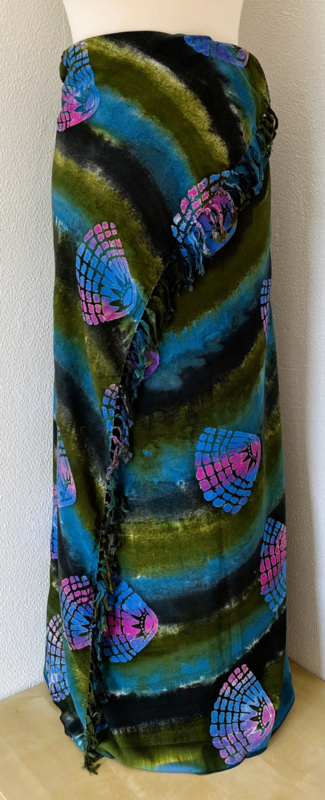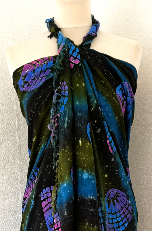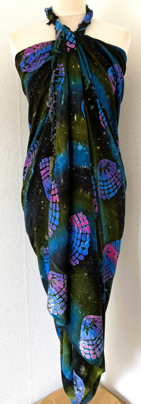 Uit de Busana Agung collectie en gemaakt met de BingBatik techniek uit Indonesie. 120 x178 cm. 100% rayon. Wasbaar op 30 graden. Met sarongknoop.