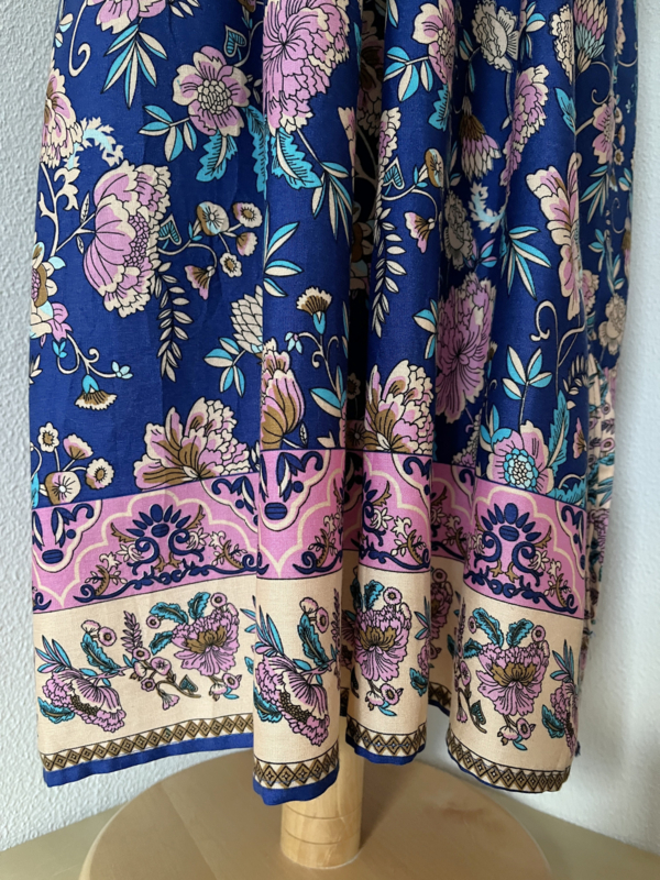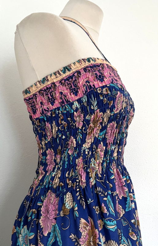 Gesmockt bovenlijfje, met halterbandje, zijsplitje, lengte 106 cm vanaf bovenkant smockrand. Bovenwijdte rekbaar tot 100 cm. One size voor maat 36 t/m 42. 100% zacht glanzende rayon.