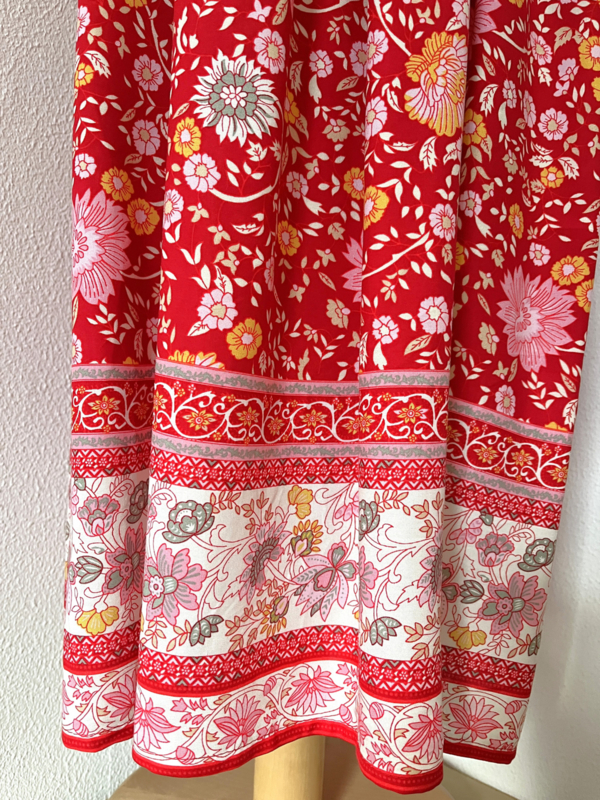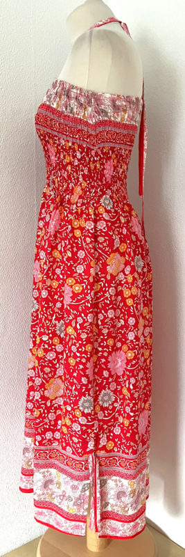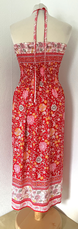 Gesmockt bovenlijfje, met halterbandje, zijsplitje, lengte 106 cm vanaf bovenkant smockrand. Bovenwijdte rekbaar tot 100 cm. One size voor maat 36 t/m 42. 100% zacht glanzende rayon.