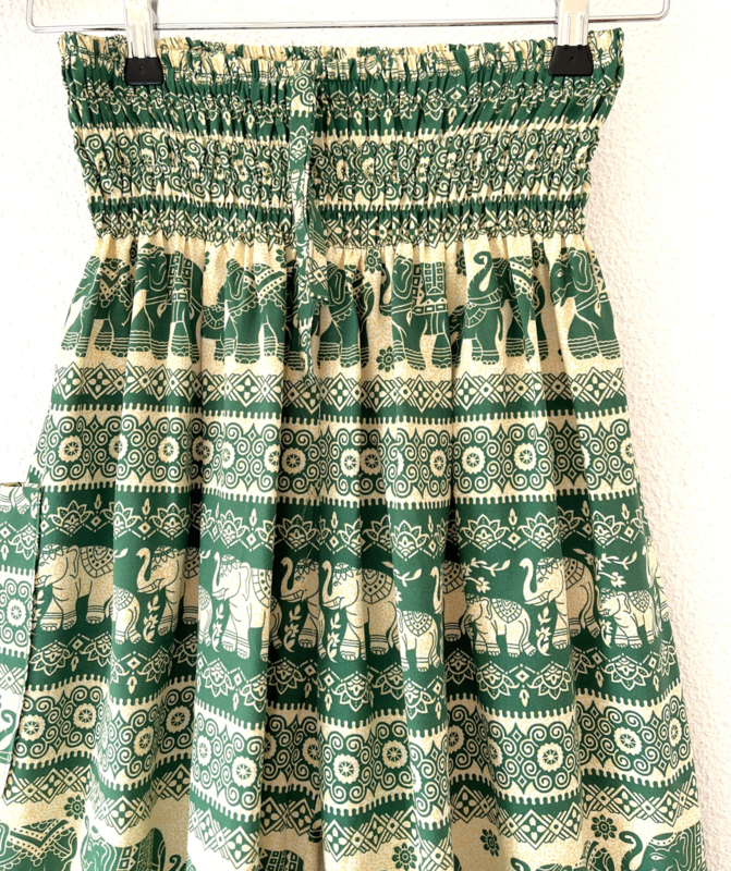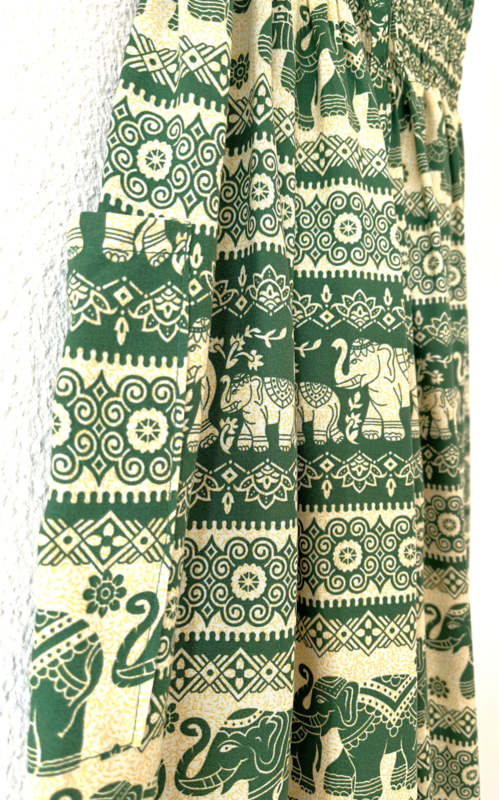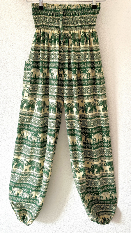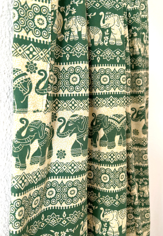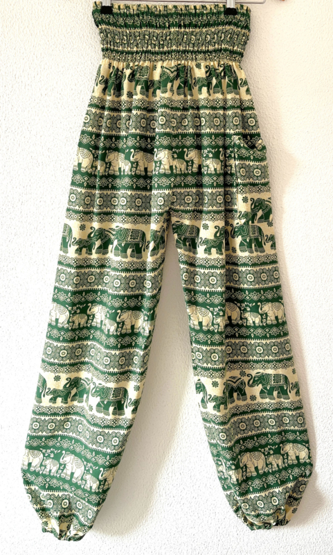 Van zachte rayon. Met breed elastiek in taille/ heupband, sierkoordje voor, opgestikt zijvakje en elastiek in enkels. Binnenbeenlengte 73 cm, Maat 38. 100% rayon.
