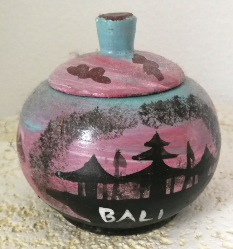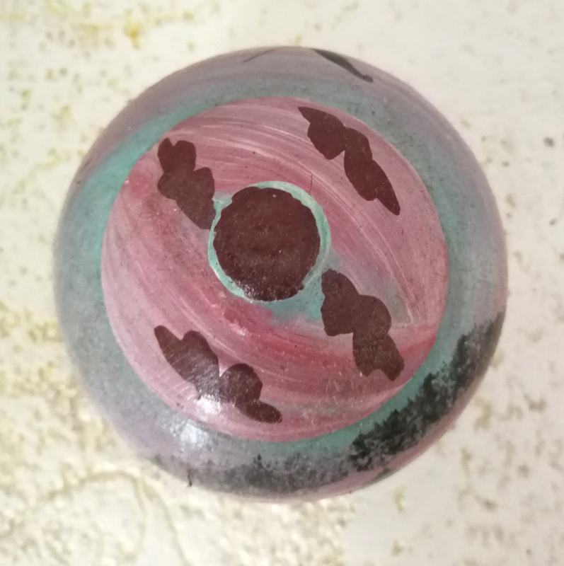 Bewerkte kokosnoot, beschilderd met Acryl verf. Diameter 8 cm.