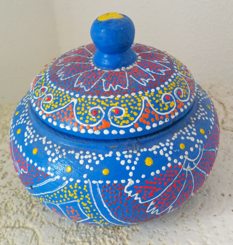 Bewerkte kokosnoot, beschilderd met Acryl verf. Diameter 14 cm.