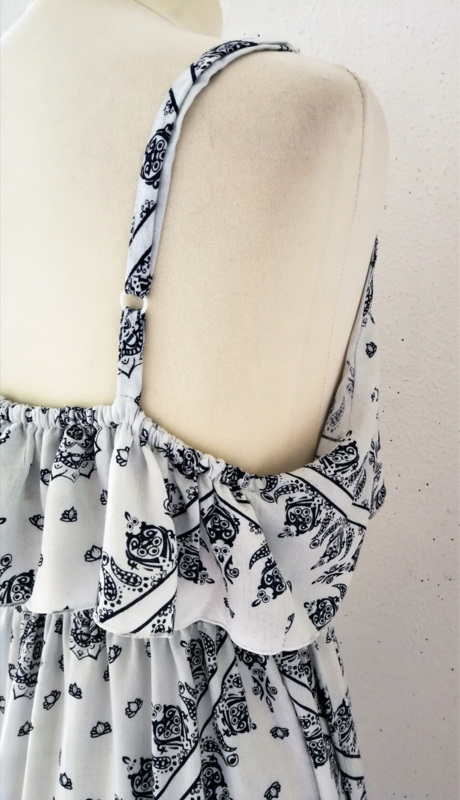 Artikelnummer: 500Y OverzichtLengte 138 cm. Bovenwijdte tot 82 cm, taille 74 cm, heup tot 108 cm. Elastische taille, dubbel losvallend bovenpand, gerimpeld achter. Verstelbare schouderbandjes, zijsplitjes. 100% rayon. Maat 36/40.