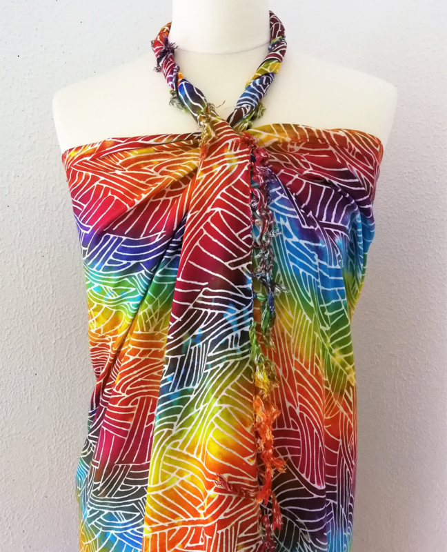 Artikelnummer: 432M OverzichtUit de Busana Agung collectie en gemaakt met de BingBatik techniek uit Indonesie. 117 x 180cm. 100% rayon. Wasbaar op 30 graden. Met sarongknoop.