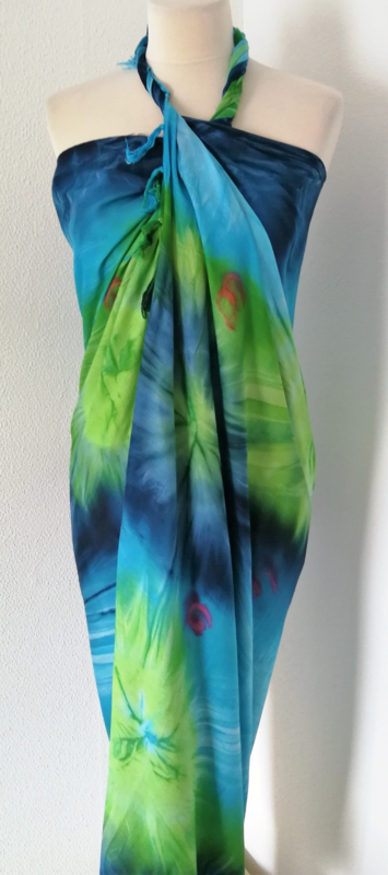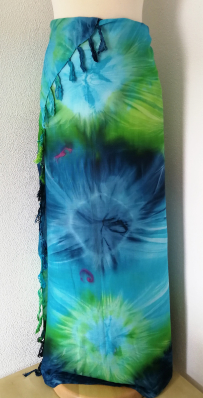 Levering uit assorti. De tie dye techniek is puur handwerk en geen sarong is eender en elk exemplaar is uniek. Daarom verschillen de kleurschakeringen en patronen per sarong.