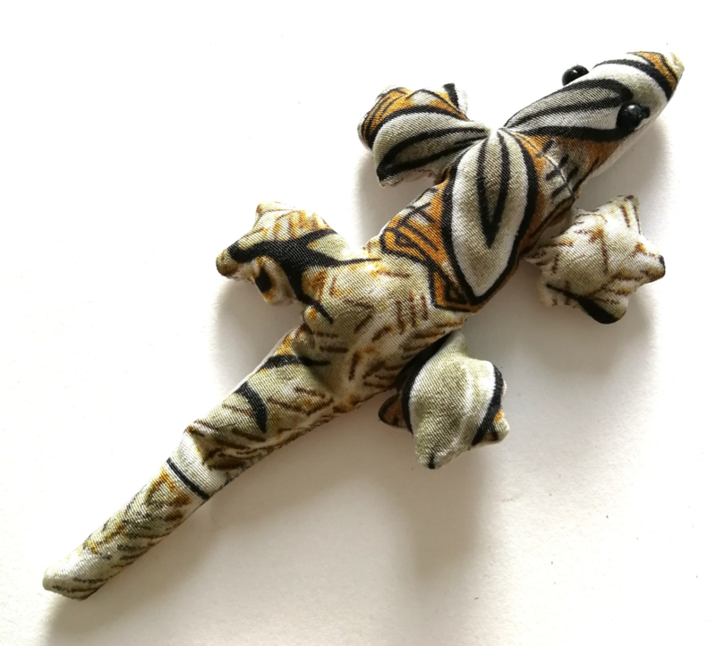 Gekko zwaarte knuffeltje XS.Gevuld met Bali zand. 41 gram. 12,5 cm lang. Levering uit assorti. Kleuren printjes verschillen onderling.