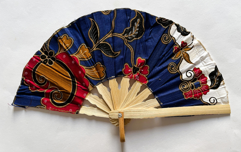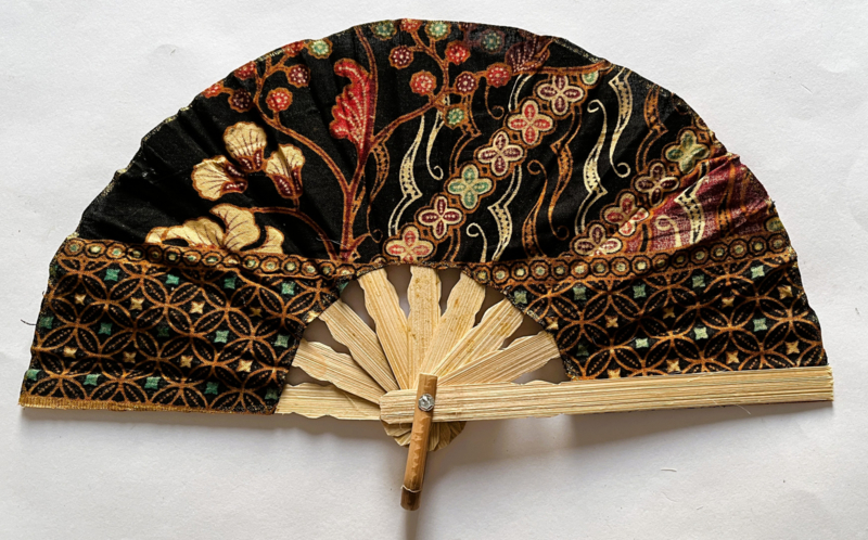 Kleurrijke waaier. Bamboe met batik stof 21,5 cm.Levering uit assorti. Prints kunnen verschillen met de getoonde foto.